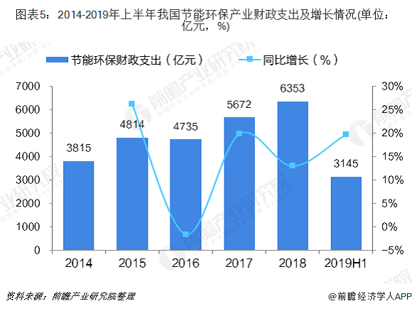 除了政策支持外,国家还加大了我国环保节能产业的财政支出力度。2014-2018年,我国节能环保产业财政支出呈上升趋势,2018年,我国环保节能支持6353亿元,同比增长13%;2019年上半年,在全国一般公共预算支出12.35万亿元中,节能环保支出3145亿元,同比增长19.7%,增速位居所有版块第二,仅低于交通运输版块(同比增长22.3%)。