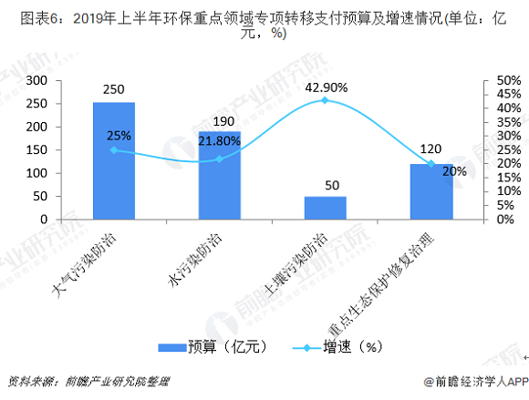 同时,2019年环保重点领域专项转移支付预算增速均高于20%。根据财政部《2019年中央对地方转移支付预算表》,2019年大气污染防治预算250亿元,较同期实际数增长25.0%;水污染防治预算190亿元,较同期实际数增长21.8%、土壤污染防治预算50亿元,较同期实际数增长42.9%、重点生态保护修复治理预算120亿元,较同期实际数增长20%。